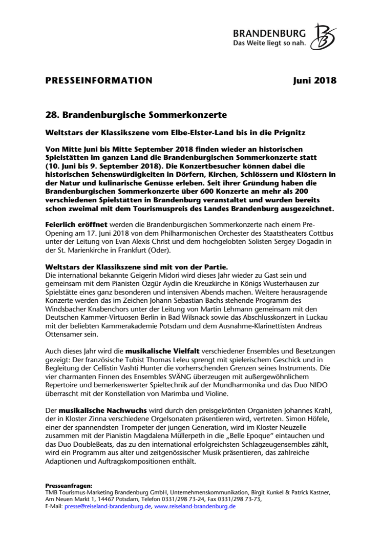 Von Mitte Juni bis Mitte September 2018 finden wieder an historischen Spielstätten im ganzen Land die Brandenburgischen Sommerkonzerte statt (10. Juni bis 9. September 2018). Die Konzertbesucher können dabei die historischen Sehenswürdigkeiten in Dörfern, Kirchen, Schlössern und Klöstern in der Natur und kulinarische Genüsse erleben.