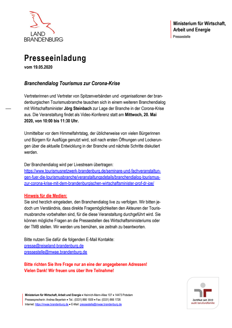 Vertreterinnen und Vertreter von Spitzenverbänden und -organisationen der brandenburgischen Tourismusbranche tauschen sich in einem weiteren Branchendialog mit Wirtschaftsminister Jörg Steinbach zur Lage der Branche in der Corona-Krise aus. Die Veranstaltung findet als Video-Konferenz statt am Mittwoch, 20. Mai 2020, von 10:00 bis 11:30 Uhr.