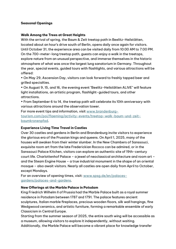 Over 30 castles and gardens in Berlin and Brandenburg will offer fascinating insights into the history of the Prussian monarchy starting April 1, 2025, inviting visitors on vivid journeys through time.