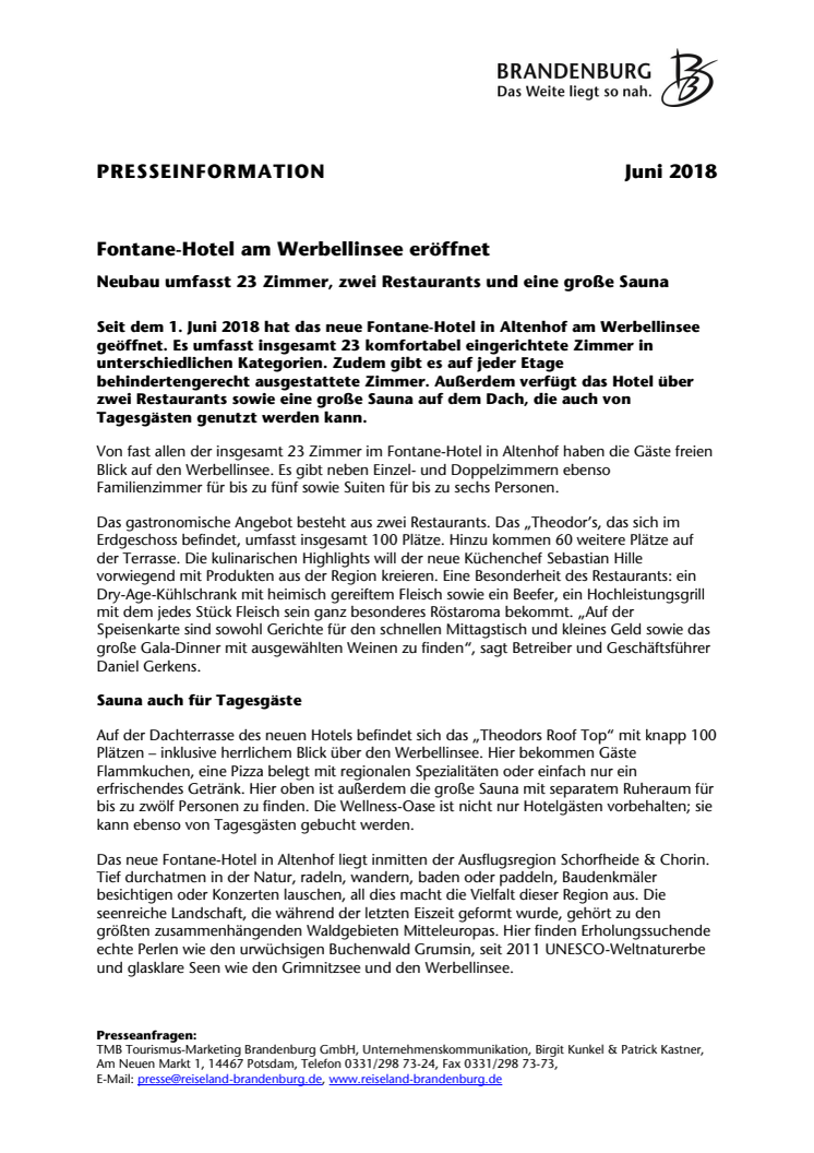 Seit dem 1. Juni 2018 hat das neue Fontane-Hotel in Altenhof am Werbellinsee geöffnet. Es umfasst insgesamt 23 komfortabel eingerichtete Zimmer in unterschiedlichen Kategorien. Zudem gibt es auf jeder Etage behindertengerecht ausgestattete Zimmer. Außerdem verfügt das Hotel über zwei Restaurants sowie eine große Sauna auf dem Dach, die auch von Tagesgästen genutzt werden kann.
