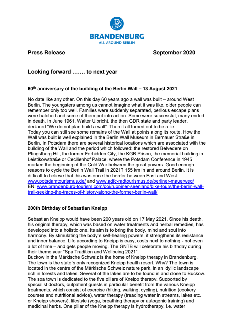 13 August 2021 will see the 60th anniversary of building of the Berlin Wall. A day to remember and a very good reason to cycle along the former route of the Wall, stopping off at places of remembrance. It is difficult to imagine that the Wall once divided Berlin (and Brandenburg). The second anniversary next year combines the tourism theme of water with wellness, as it celebrates Sebastian Kneipp ´s 200th birthday. The spa town of Buckow in the Märkische Schweiz is the ideal place to experience Kneipp´s therapies and improve your health.