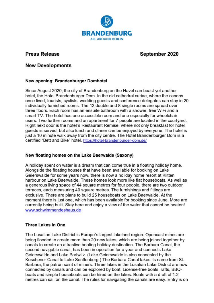 Snippets of news from Brandenburg on the Havel, where the Domhotel opened recently and from the Lusatian Lake District, where Lake Partwitzer is now joined to Lake Geierswalde and Lake Senftenberg by the Barbara Canal. More news from the Lusatian Lake District – floating holiday homes are now available for booking on Lake Bärwalde.