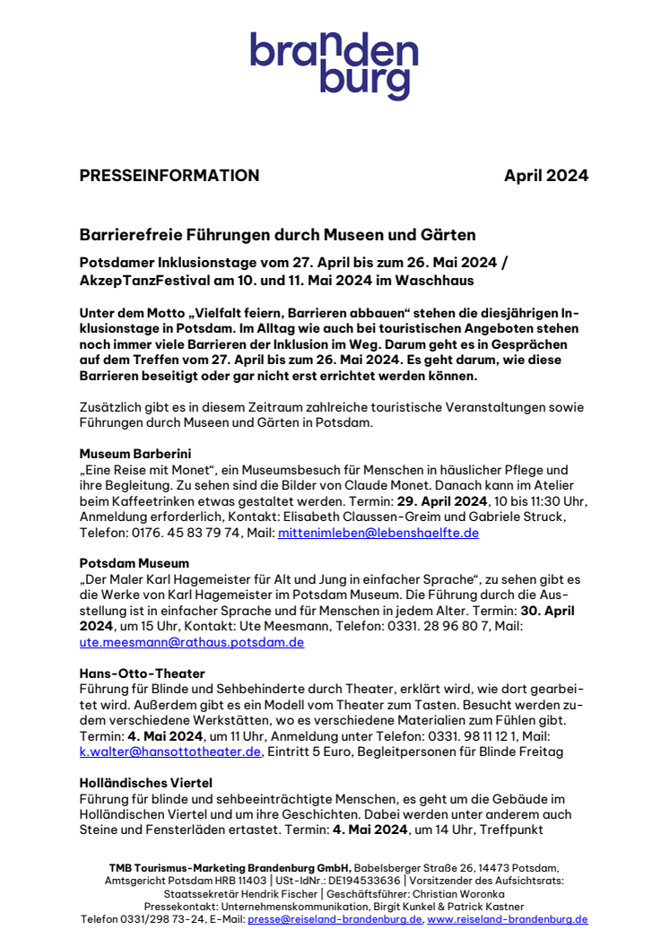 TMB Tourismus-Marketing Brandenburg GmbH, Babelsberger Straße 26, 14473 Potsdam