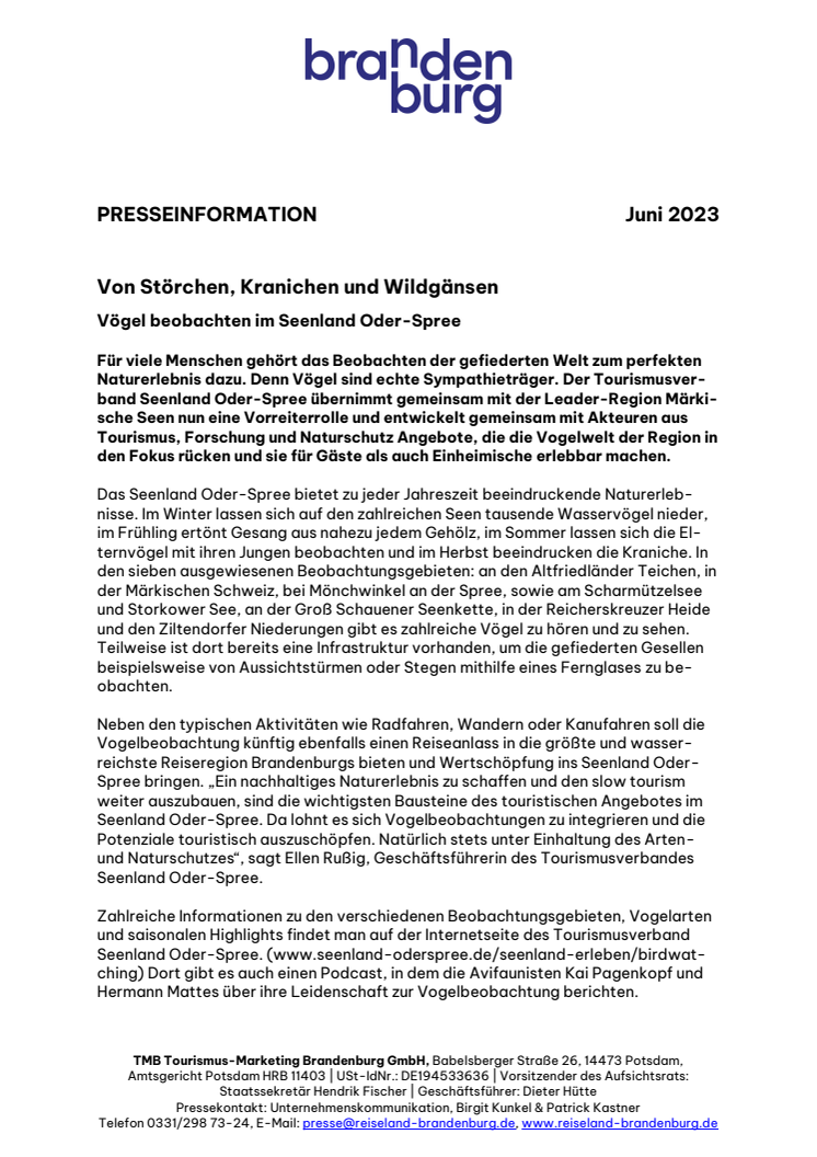 Vögel sind echte Sympathieträger. Der Tourismusverband Seenland Oder-Spree übernimmt gemeinsam mit der Leader-Region Märkische Seen nun eine Vorreiterrolle und entwickelt gemeinsam mit Akteuren aus Tourismus, Forschung und Naturschutz Angebote, die die Vogelwelt der Region in den Fokus rücken.