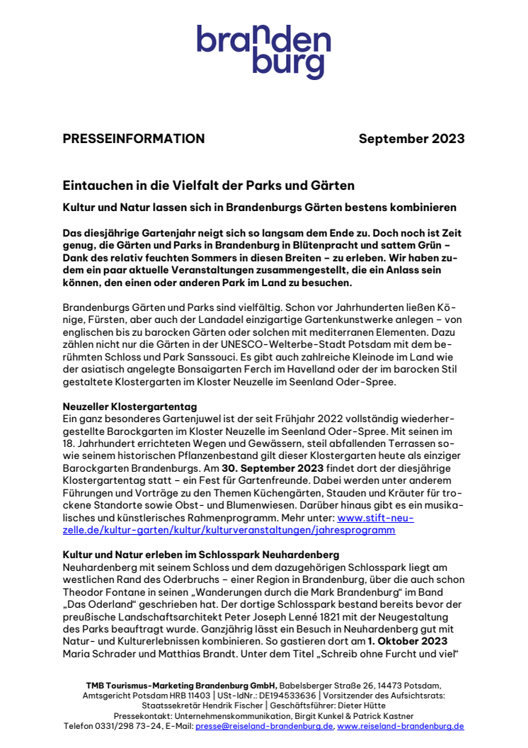 Und: Das diesjährige Gartenjahr neigt sich so langsam dem Ende zu. Doch noch ist Zeit genug, die Gärten und Parks in Brandenburg in Blütenpracht und sattem Grün zu erleben. Wir haben dazu auch aktuelle Veranstaltungen zusammengestellt, die ein Anlass zum Besuch sein können.