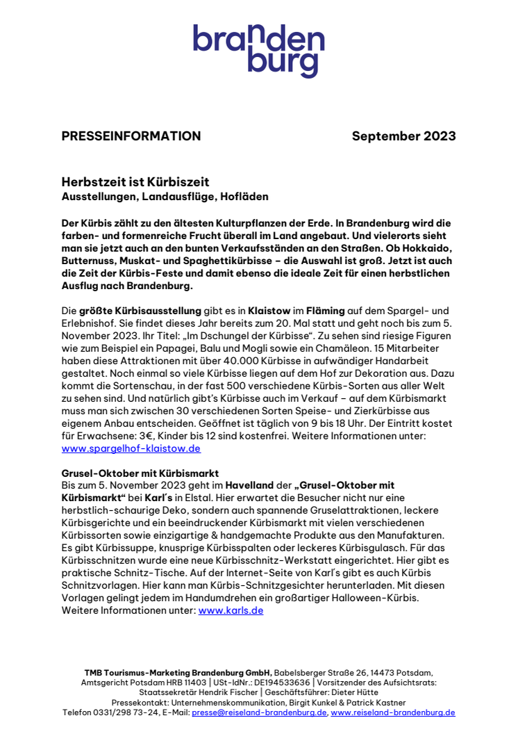 Vielerorts sieht man sie jetzt an den bunten Verkaufsständen an den Straßen. Ob Hokkaido, Butternuss, Muskat- und Spaghettikürbisse – die Auswahl ist groß. Jetzt ist die Zeit der Kürbis-Ernte und -Feste und damit ebenso die ideale Zeit für einen herbstlichen Ausflug nach Brandenburg.