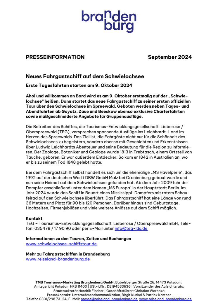 Genau einen Monat zuvor, am 9. Oktober 2024, heißt es erstmalig ahoi und willkommen an Bord auf der „Schwielochsee“. Dann startet das neue Fahrgastschiff zu seiner ersten offiziellen Tour über den Schwielochsee im Spreewald. Geboten werden neben Tages- und Abendfahrten ab Goyatz, Zaue und Beeskow ebenso exklusive Charterfahrten sowie maßgeschneiderte Angebote für Gruppenausflüge.