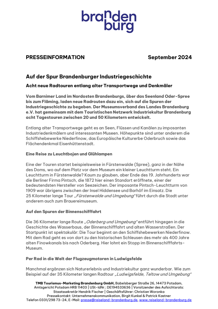 Von Land gibt es ebenso Neues zu berichten: Vom Barnimer Land im Nordosten Brandenburgs, über das Seenland Oder-Spree bis zum Fläming, laden neue Radrouten dazu ein, sich auf die Spuren der Industriegeschichte zu begeben. Der Museumsverband des Landes Brandenburg e.V. hat gemeinsam mit dem Touristischen Netzwerk Industriekultur Brandenburg acht Tagestouren zwischen 20 und 50 Kilometern entwickelt.