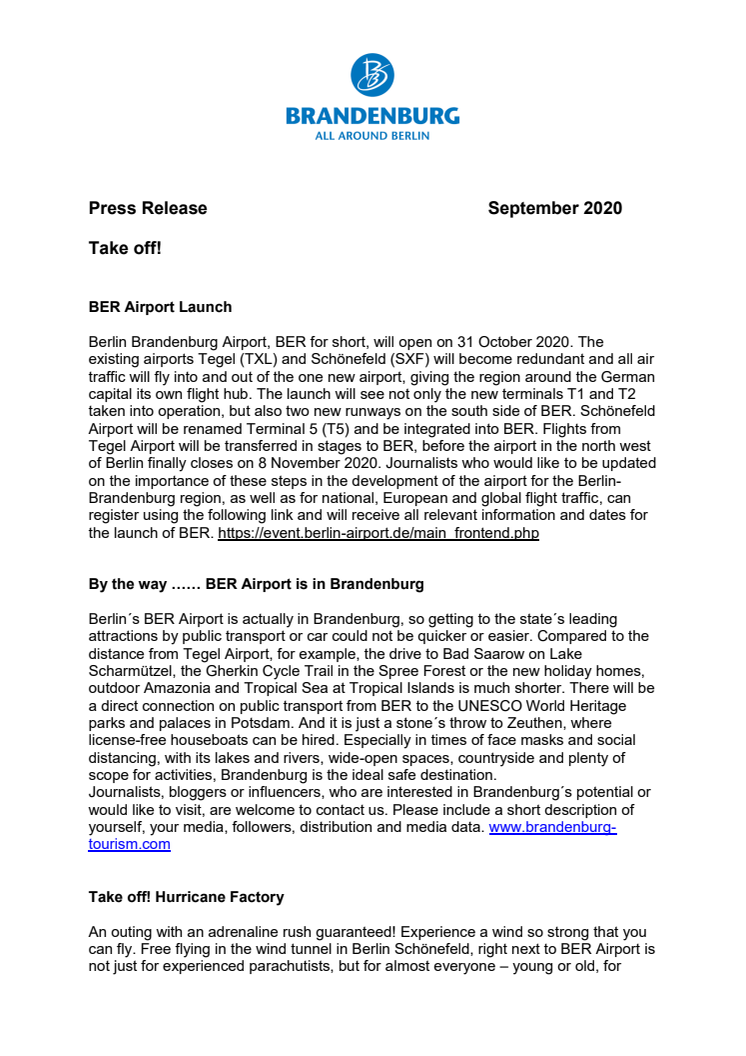 As they say, “only flying is better”. Berlin-Brandenburg Airport will open on 31 October 2020. The airport is located in Brandenburg and its well-developed transport links mean that several of the state´s tourist attractions are much quicker to reach than from Tegel Airport. There are also direct connections on public transport to Potsdam. Right next to the airport you can experience flying like a bird – in a wind tunnel, where the air flow is strong enough for a take off!