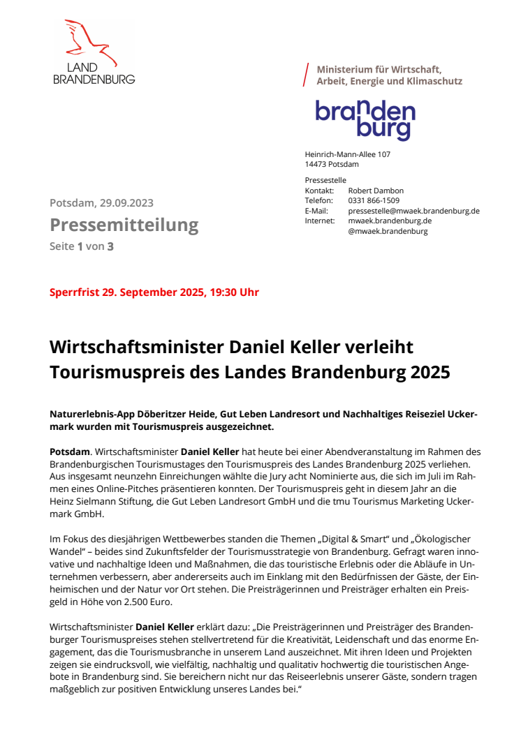 Potsdam. Wirtschaftsminister Daniel Keller hat heute bei einer Abendveranstaltung im Rahmen des Brandenburgischen Tourismustages den Tourismuspreis des Landes Brandenburg 2025 verliehen. Aus insgesamt neunzehn Einreichungen wählte die Jury acht Nominierte aus, die sich im Juli im Rahmen eines Online-Pitches präsentieren konnten. Der Tourismuspreis geht in diesem Jahr an die Heinz Sielmann Stiftung, die Gut Leben Landresort GmbH und die tmu Tourismus Marketing Uckermark GmbH.